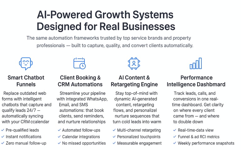 We design and install complete AI-powered systems that help you attract, qualify, and convert clients automatically — including chatbots, CRM automations, booking flows, and lead funnels integrated with WhatsApp, email, or your website.